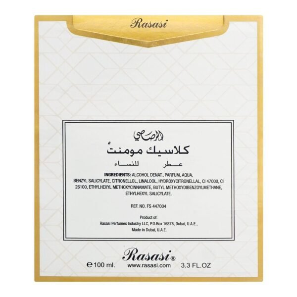 - Rasasi Classic Moment EDP For Women: Timeless Floral Sweet Musky Eau De Parfum.